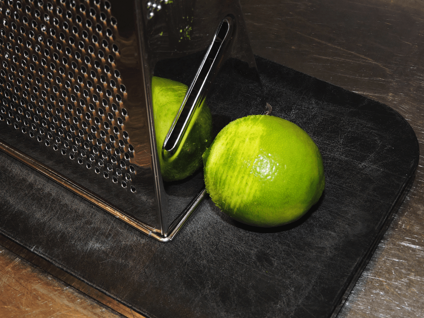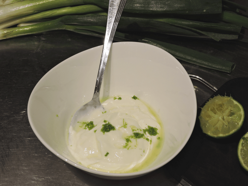 Tvätta och borsta limen i varmt vatten. Riv skalet av halva limen på fina sidan av rivjärnet och lägg i yoghurten. Skär limen i två halvor och pressa ur saften ur ena halvan ner i yoghurten.