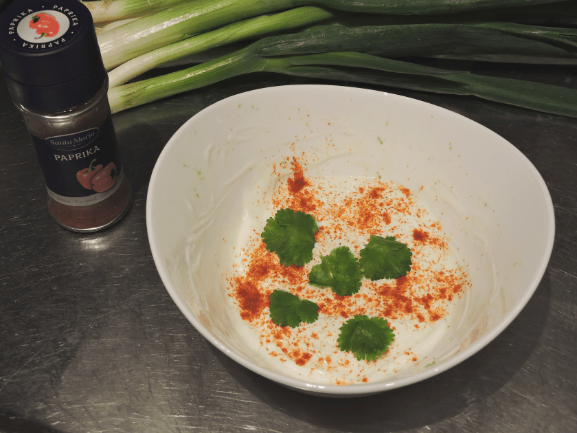 Tillsätt ett kryddmått hushållsalt och rör om ordentligt. Strö över lite paprikapulver och garnera med ett par korianderblad. Ställ såsen kallt tills du ska äta den.