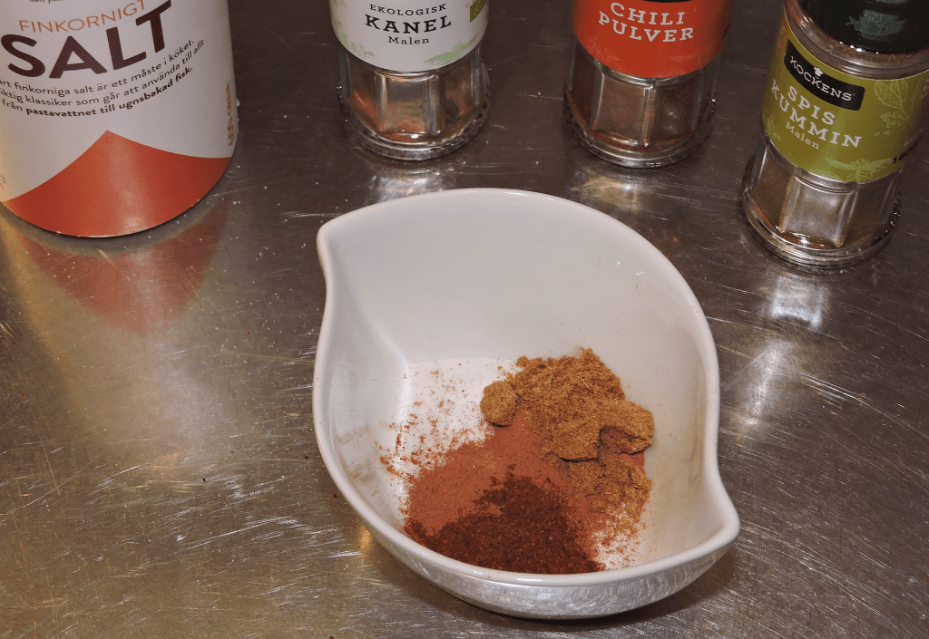 Blanda salt, kanel, chilipulver och spiskummin i en liten skål.