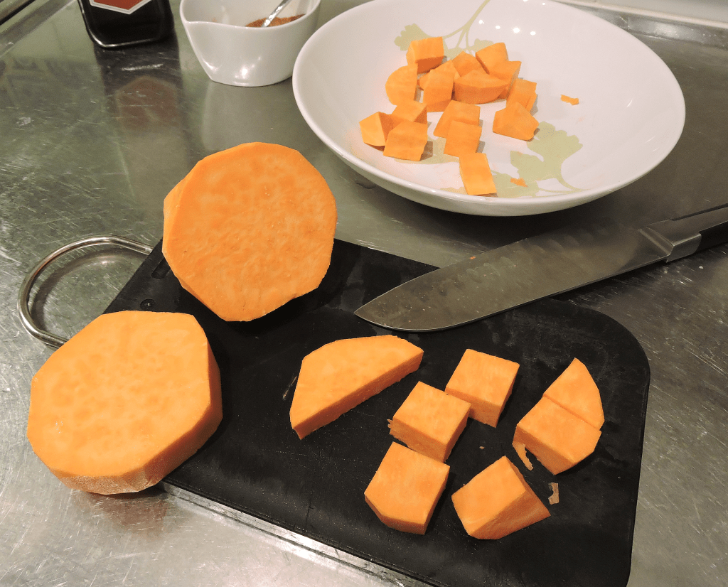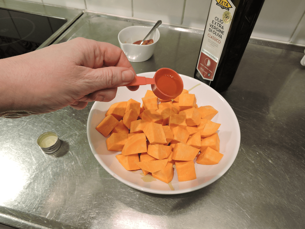 Skala sötpotatisen och skär den i cirka 1-2 cm stora bitar. Vi brukar ibland göra bitarna lite mindre eller tunnare – då blir tillagningstiden också kortare, så klart.