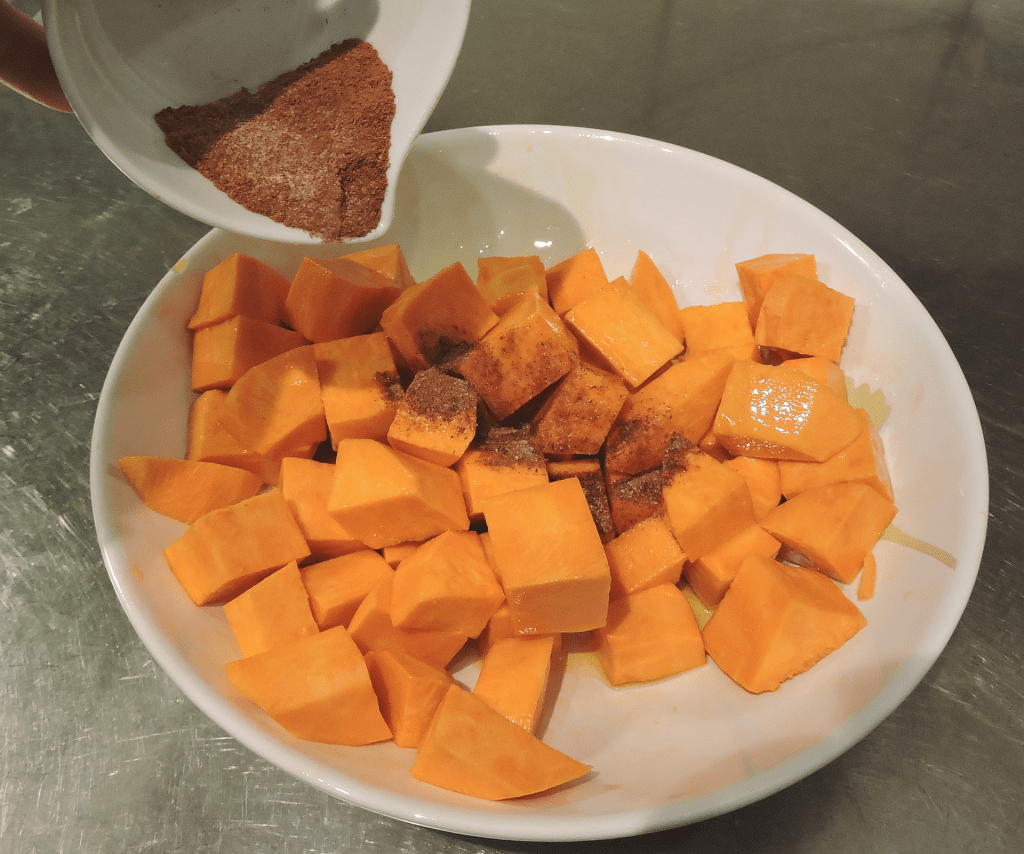 Strö över kryddblandningen. Upprepa proceduren med att blanda runt tills sötpotatisbitarna fått kryddor över sig.