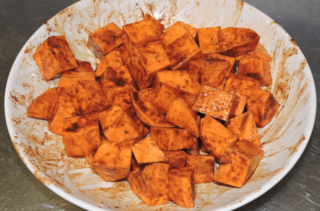 Spreja eller ringla olivolja över sötpotatisbitarna. Blanda om ordentligt med händerna så att alla bitar får lite olja på sig.
