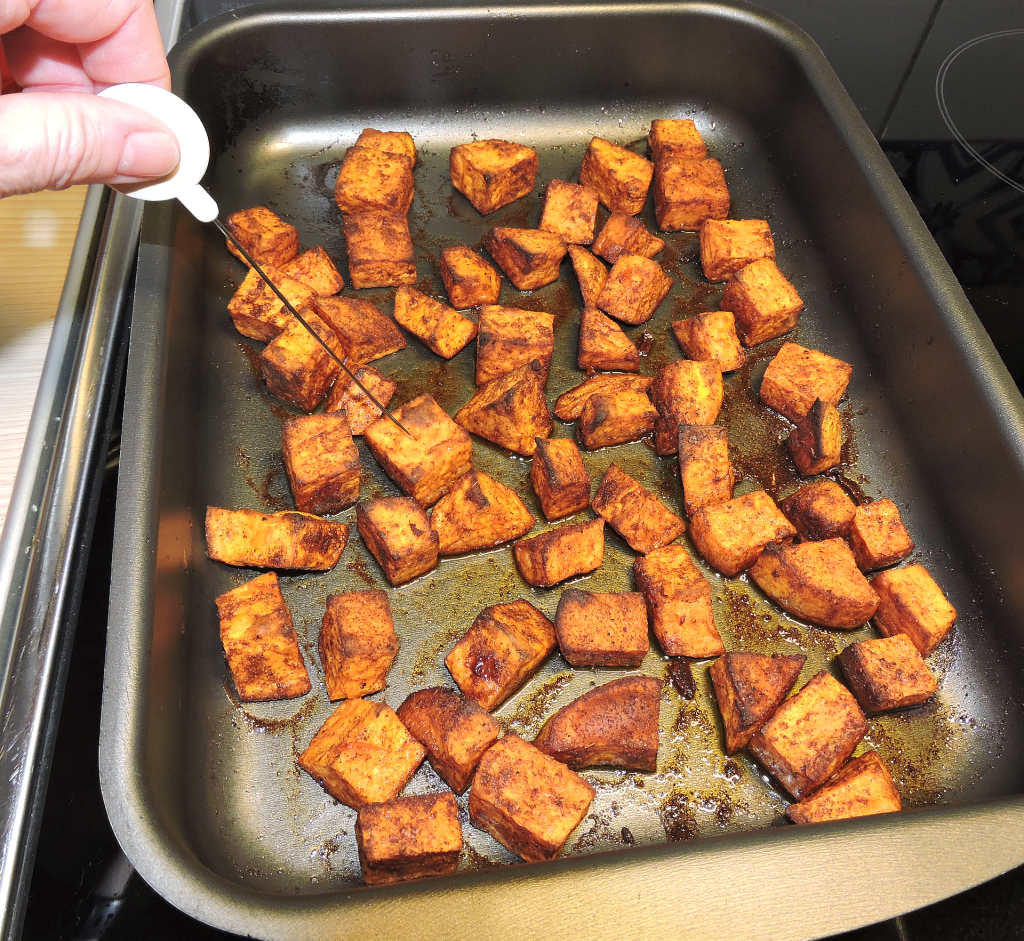Sätt in plåten i mitten av ugnen och låt baka i ytterligare cirka 10-20 minuter. Sötpotatisen är färdiga när bitarna är mjuka inuti och krispiga på ytan.