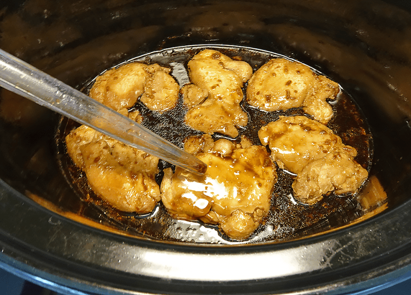 Ta locket av din slow cooker och vänd kycklingfiléerna. Pensla eller spruta sås över dem med en såspipett (det är nästan enklare).