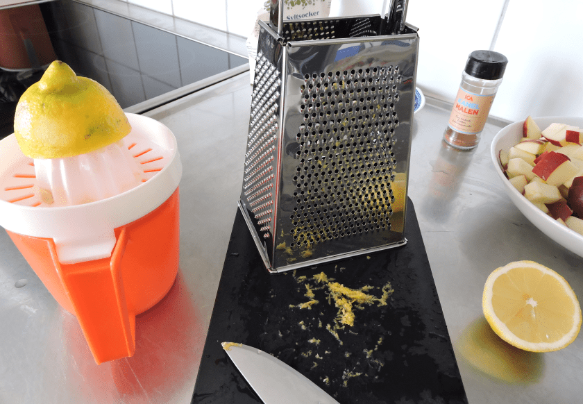 Borsta citronen under rinnande ljummet vatten. Torka den torr med hushållspapper. Riv det gula på citronskalet på den fina sidan av ett rivjärn. Försök att undvika att få med det vita som sitter under skalet, för det är ofta väldigt beskt. Dela citronen och pressa ut saften i en skål eller tillbringare.