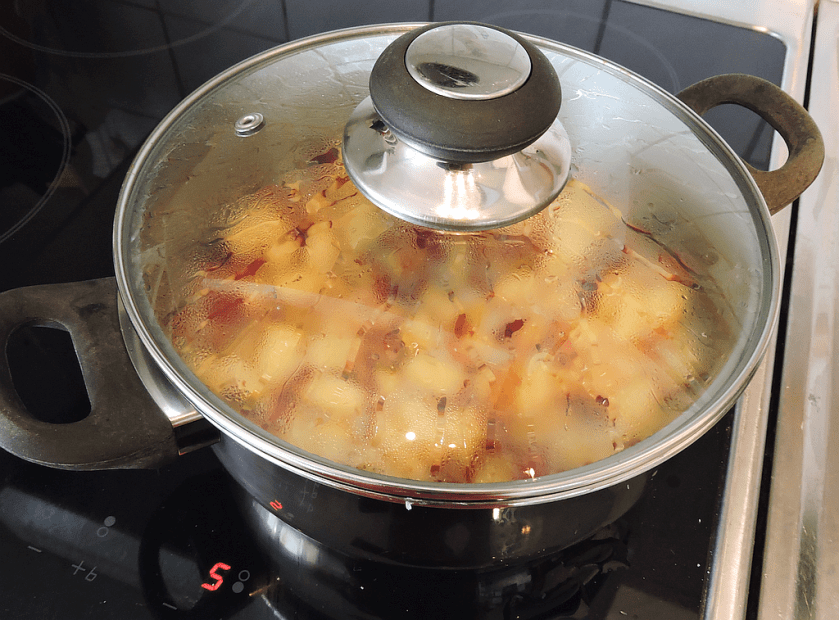 När sockret har smält helt sänker du värmen lite och lägger på ett lock. Marmeladen behöver fortfarande småkoka lite. Låt puttra i cirka 15 minuter tills äppelbitarna blivit mjuka. Rör då och då.