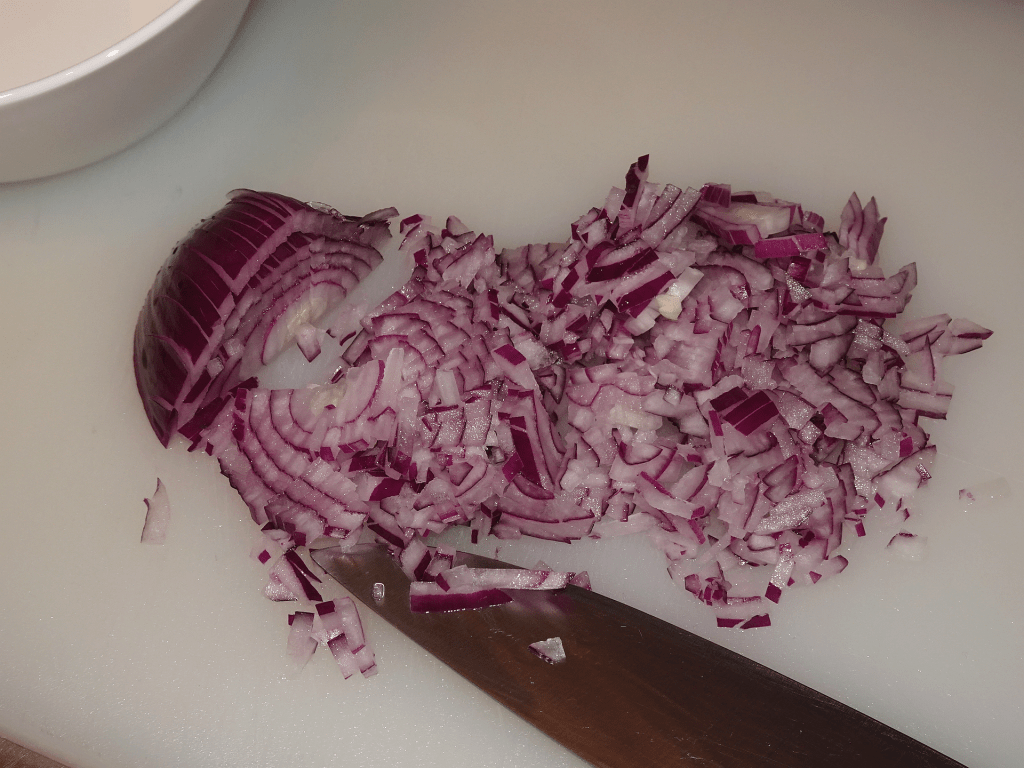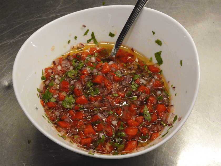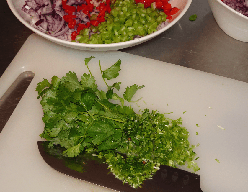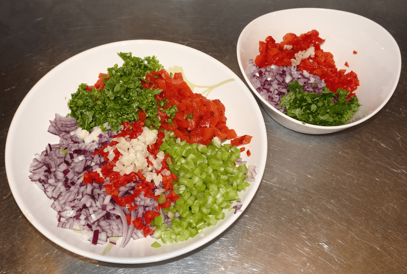 Nu har du en större skål med grönsaker som ska ner i grytan, samt en lite mindre medelstor skål med det som ska bli din färska salsa.