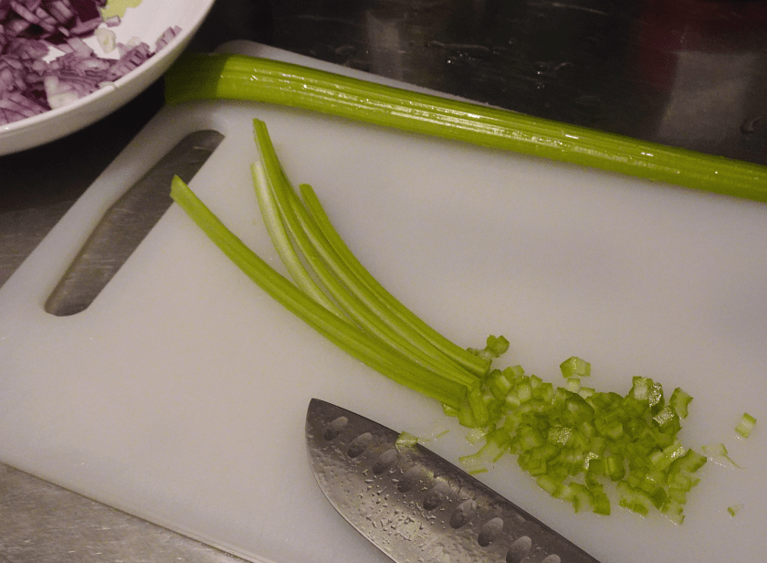 Skölj selleristjälkarna och hacka dem fint. Lägg dem i den större skålen med löken och paprikan.