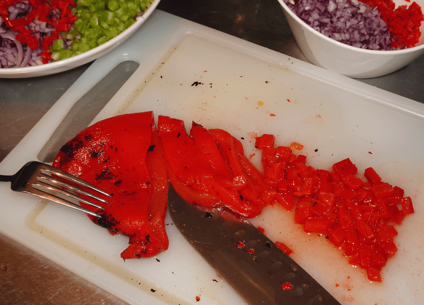 Hacka paprikorna. Lägg 2/3 i den större skålen med löken och vitlöken. Finhacka resten och lägg i den medelstora skålen.