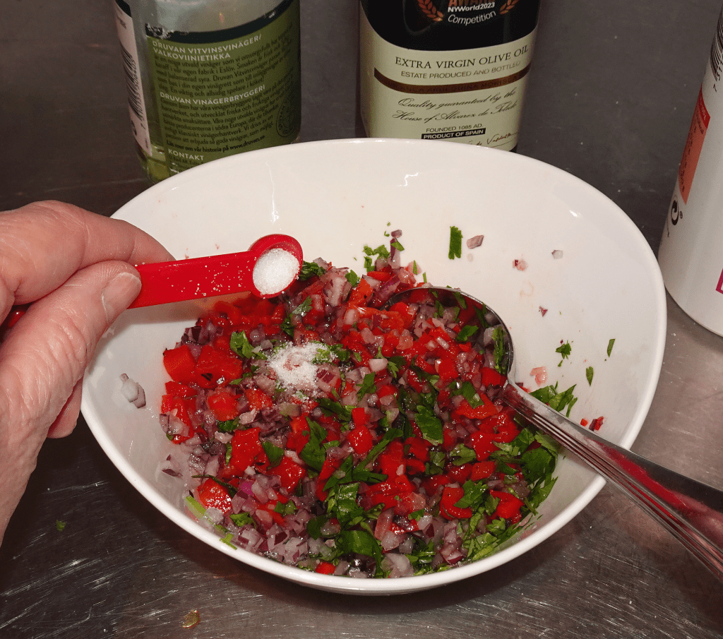 Under tiden soppan sjuder så gör du din salsa. Strö ¼ tsk salt över de finhackade grönsakerna i den medelstora skålen. Häll på 1 msk vitvinsvinäger och ¼ dl extra fin jungfrulig olivolja.