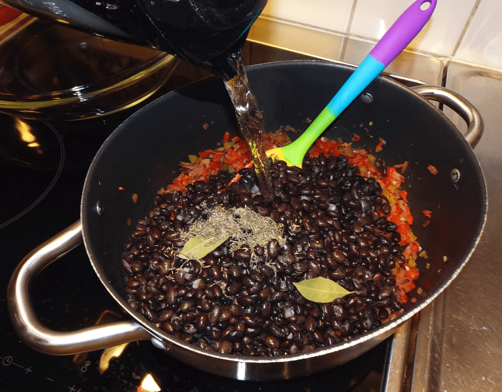 När grönsakerna sauterats färdigt tillsätter du bönorna samt innehållet i den lilla skålen med timjan, svartpeppar och lagerblad. Häll också över det varma vattnet.
