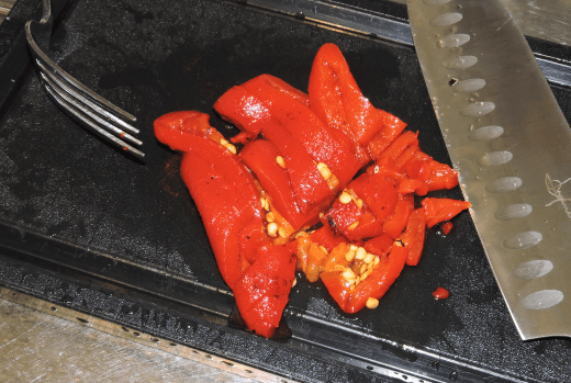 Föregående bild Nästa bild Skär paprikan i bitar Skär den grillade paprikan i bitar. Skär den grillade paprikan i bitar.